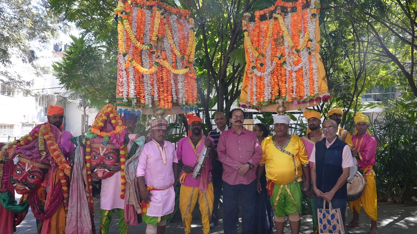 Releasing a booklet about the event “Krishna to Kaveri” M.C. Ramesh, Chairperson – Karnataka Shilpa Kala Academy said it is our collective responsibility to promote the 2500-year-old rich heritage of Kannada and Karnataka. Vikram Bhat, Director, BIC welcomed everyone to the event. Sudheesh Venkatesh, Chief Communication Officer, Azim Premji Foundation, presented mementoes to guests and S.V Manjunath Associate Director, Kannada Initiatives, Azim Premji University, introduced the guests to the gathering. Performances of traditional Pooja Kunitha and Somana Kunitha, folk dances from the Old Mysuru region, performed by Sri Vinayaka Yuvakara Kala Balaga and a rendition of the NaaDa Geethe by students of the Suraaghavi Foundation preceded the inaugural ceremony.